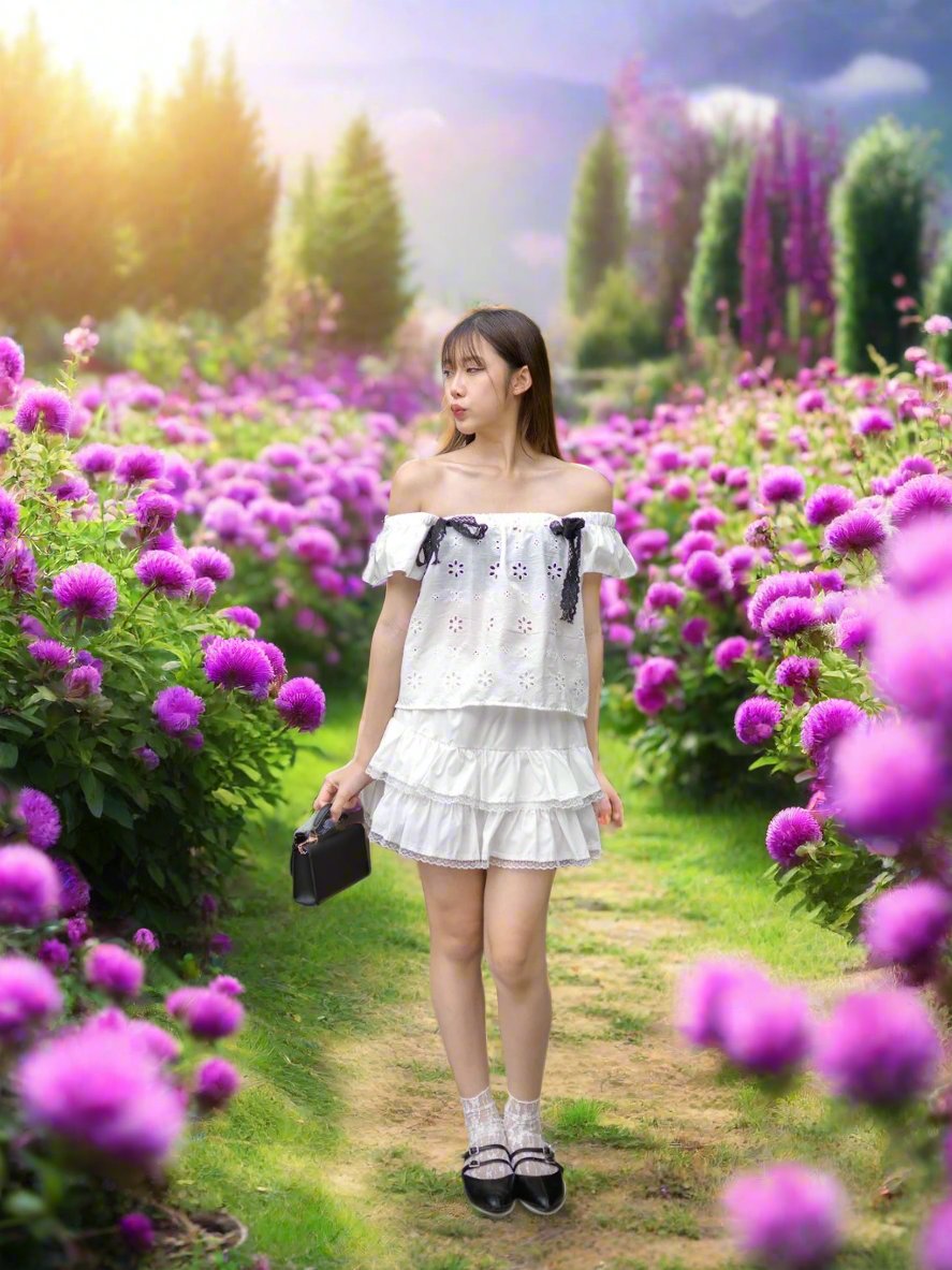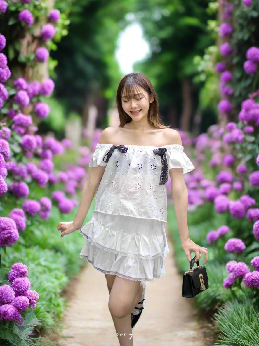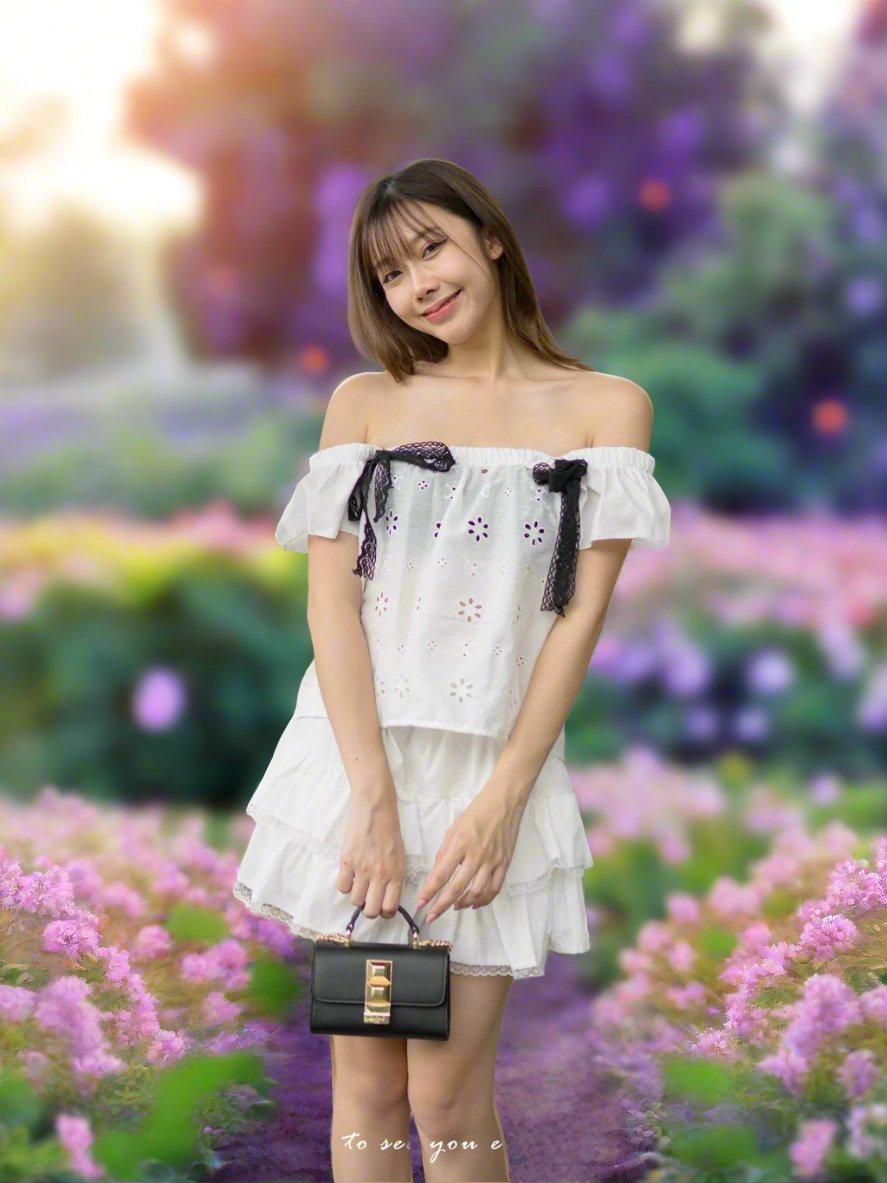 Crafted from embroidered lace fabric, this Amity Crop Top features a square-neck, elastic gathering, and ruffled sleeves. Finished with a black lace ribbon, it offers versatile styling options - off-shoulder or on-shoulder. Perfectly paired with pants or skirts.
