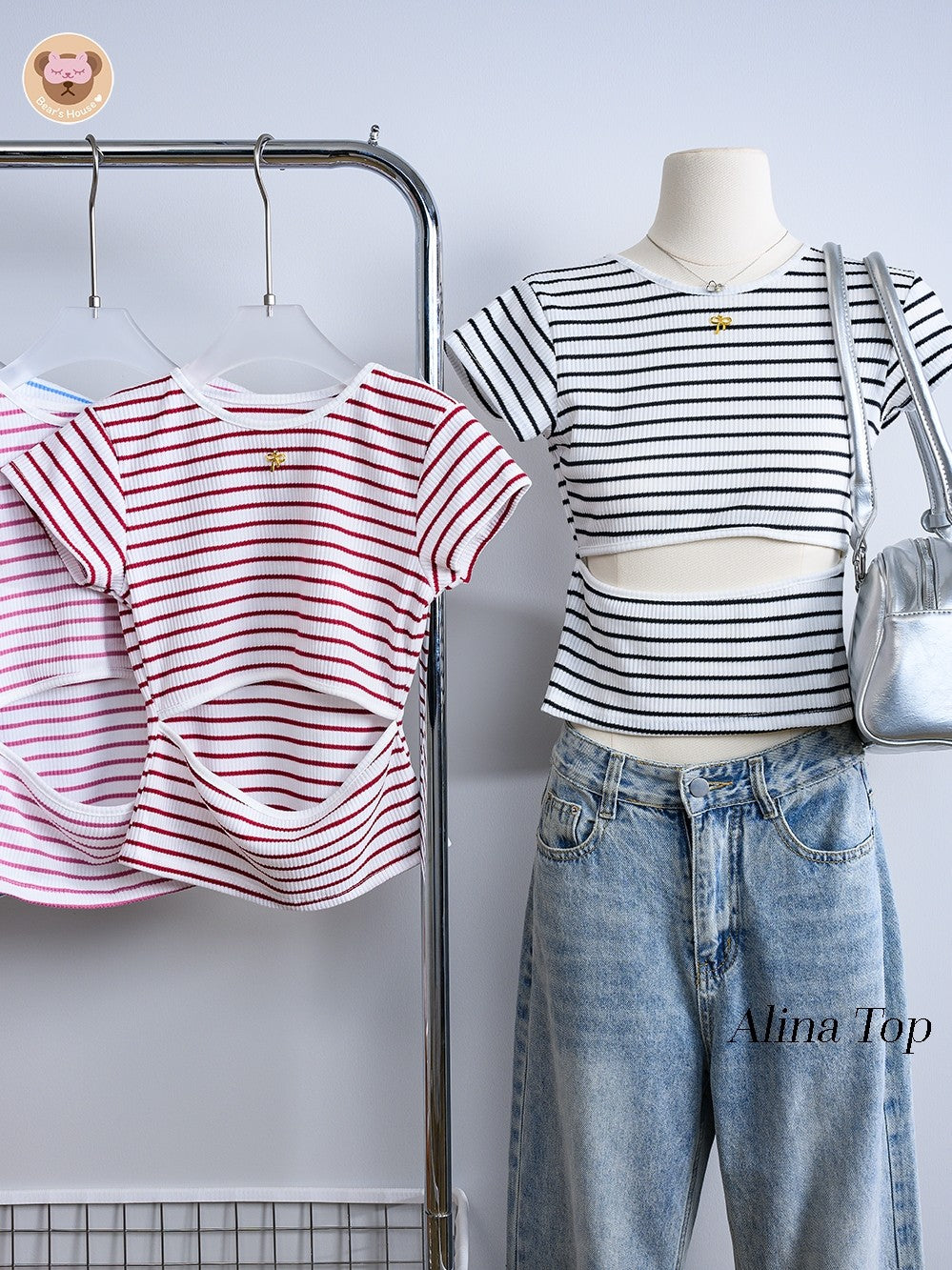 The Alina Top features a split waist with adorable gold bow embellishments on its striped fabric, adding a touch of cuteness to your wardrobe. It's the perfect fit, with just the right amount of sexiness to have in your closet.