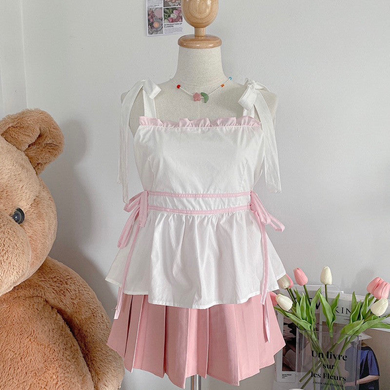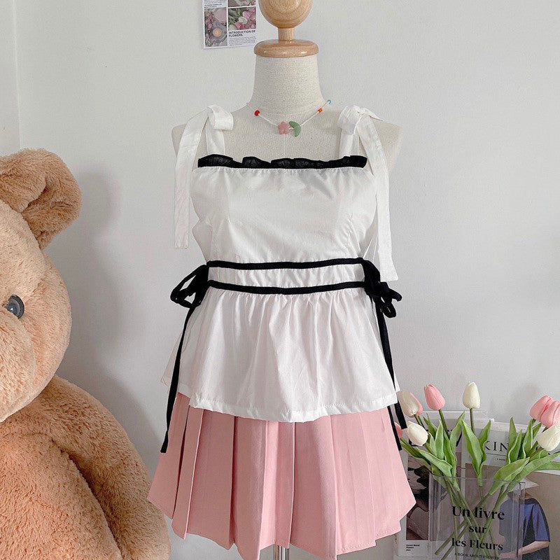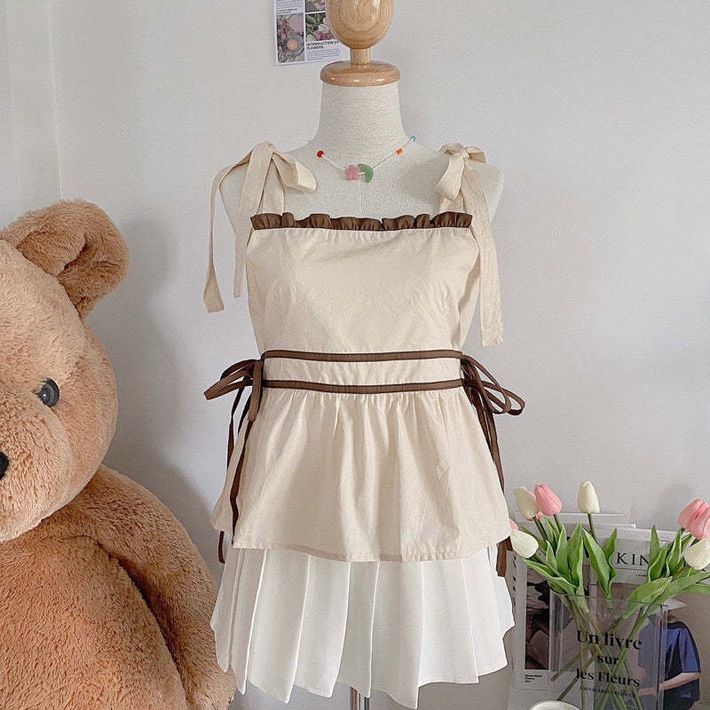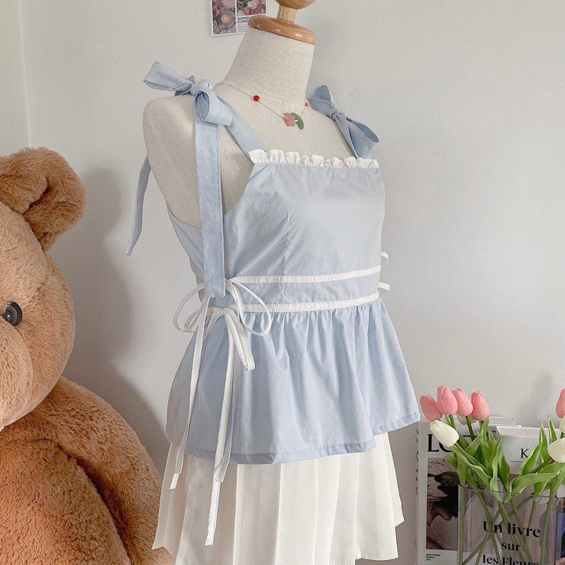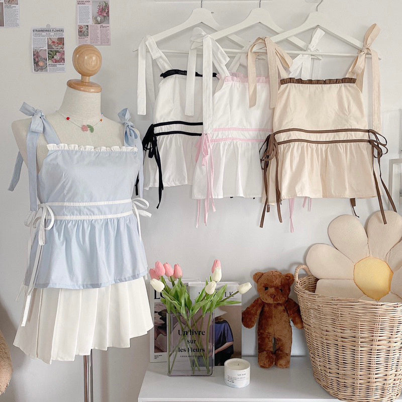 This spaghetti strap top boasts bow ties on the shoulders and many intricate details, such as charming side ties that enhance its appearance from all angles. Additionally, it includes a chest lining crafted to exceptional quality.