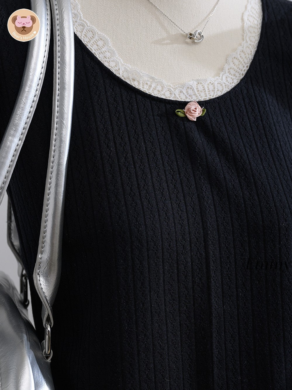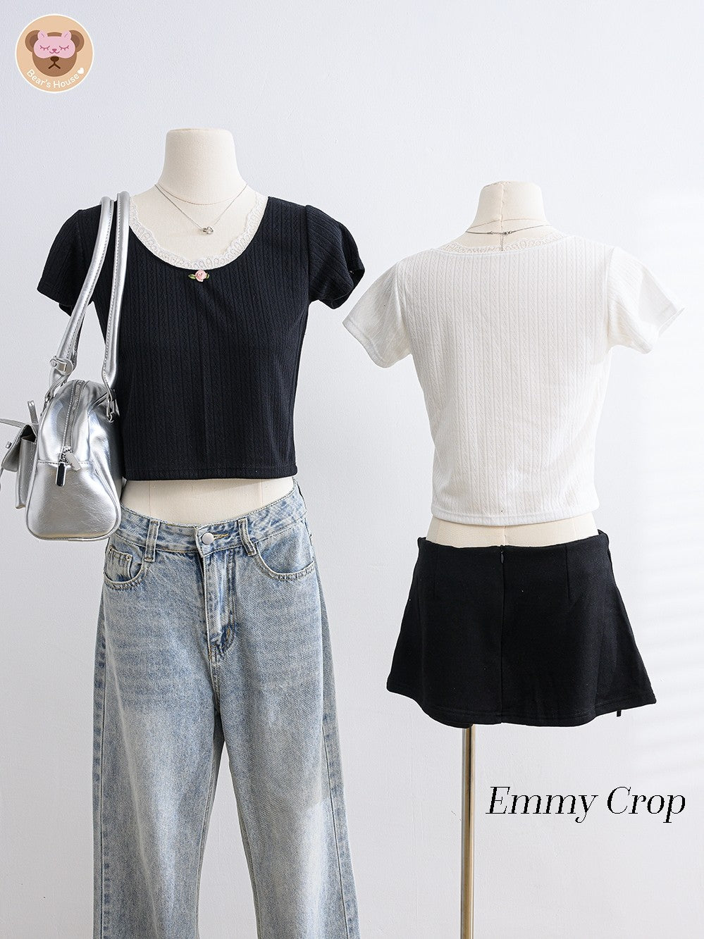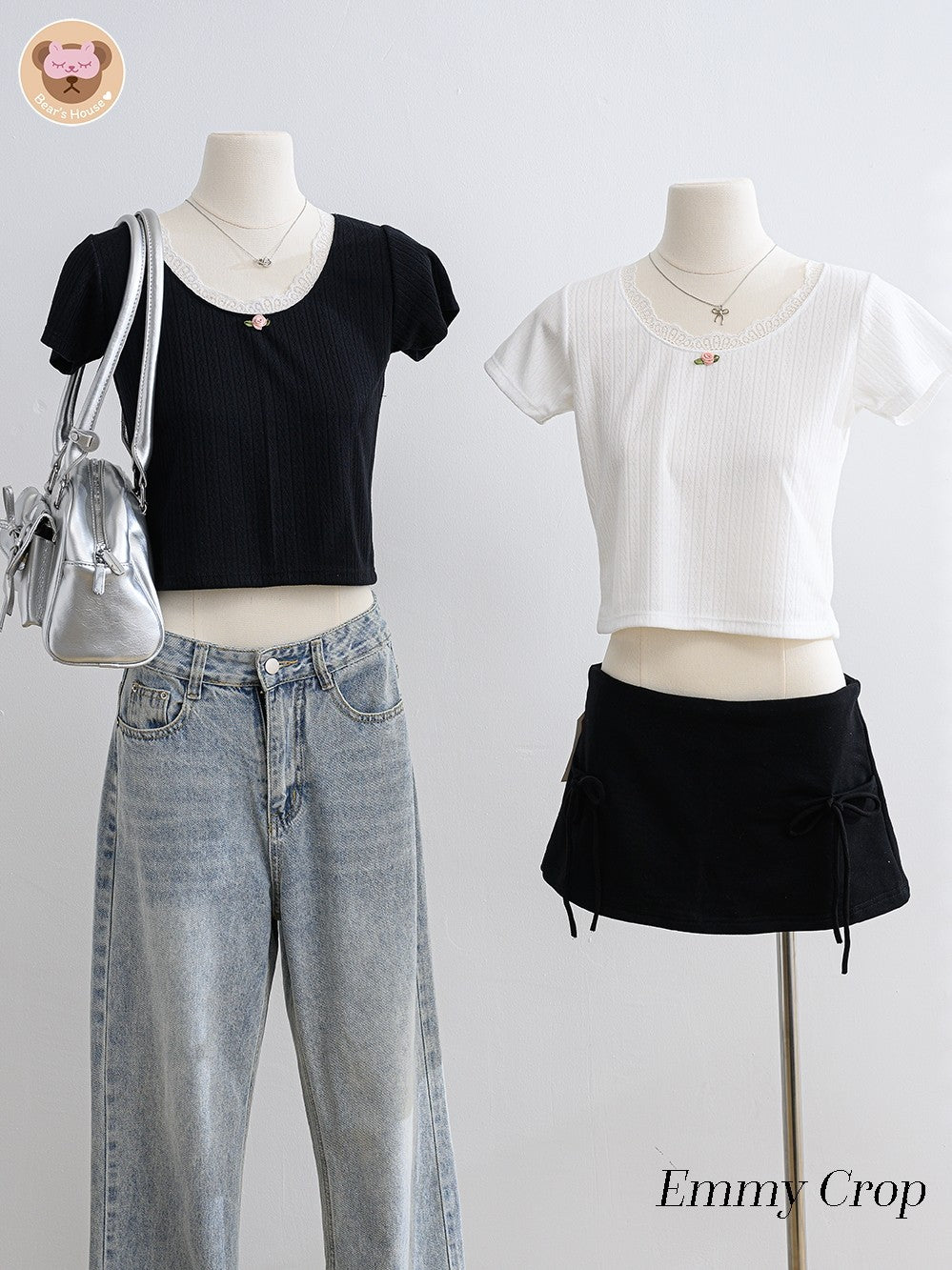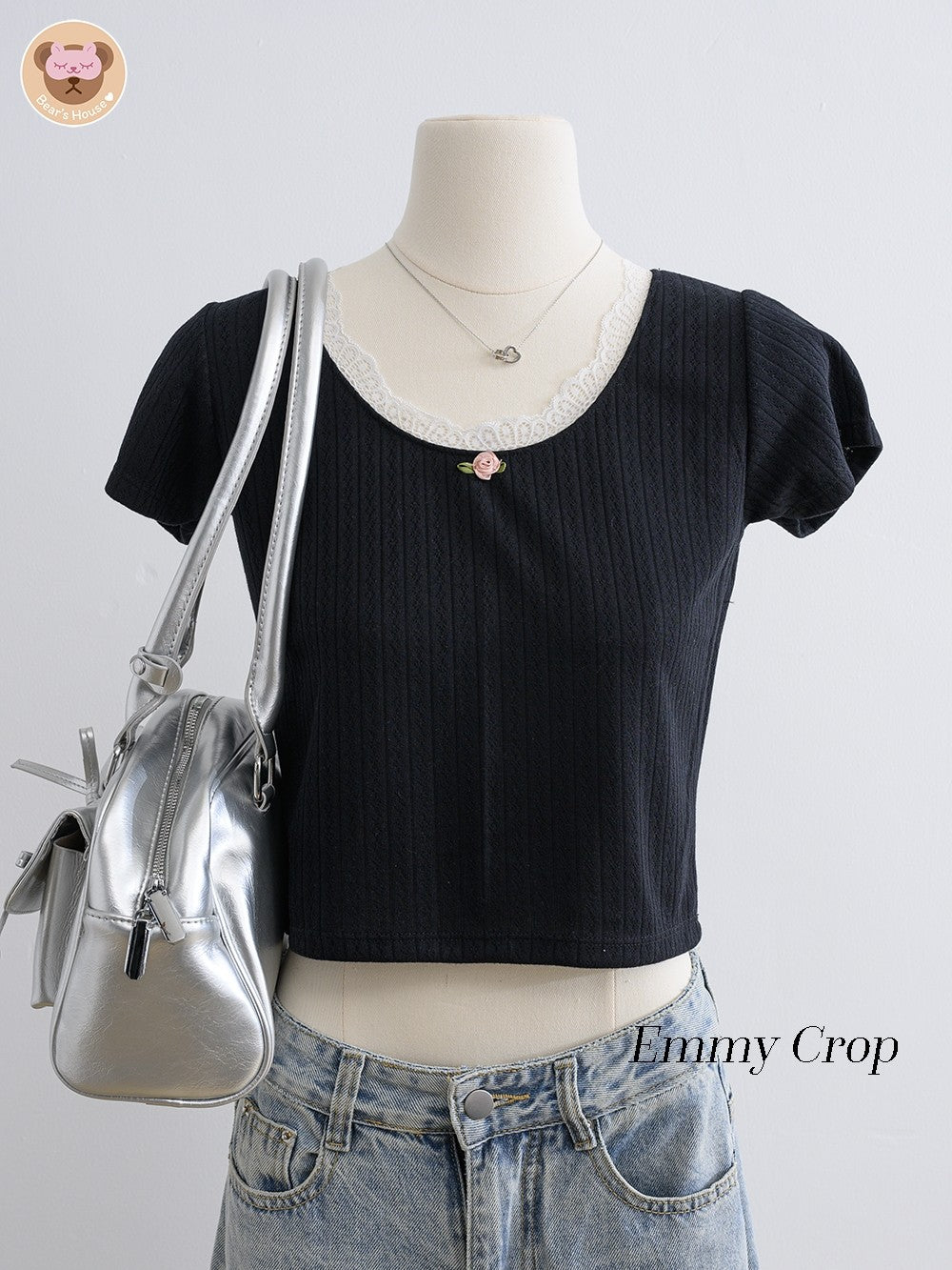 Emmy Crop t-shirt with square neckline, featuring playful pink roses and charming lace accents. The perfect blend of simplicity and cuteness, easily paired with skirts or pants.
